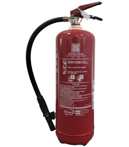 Extincteur 9L à eau pulvérisée sans fluor efficace pour les feux de classe A et B (feux secs et gras). À Pression Permanente, capacité d'extinction élevée: 21A‑233B Certifié NF. Livré avec support métallique. Durée de vie 20 ans avec maintenance. Maintenance possible par Fireless. .. ...