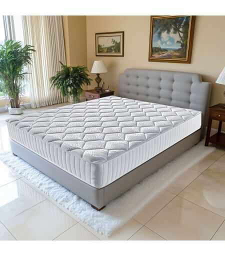 Matelas d'une Hauteur de 23 cm avec Ressorts ensachés Caractéristiques : Faces de couchages réversibles avec Mousse rembourrage 100 % polyester Âme 100 % polyuréthane poli latex brevetée indéformable Confort : Accueil FERME - Soutien Très FERME pour un repos idéal Garanti 5 ans et une très bonne indépendance de couchage Durée incroyablement longue caractérise le produit et ses performances Ventilation : Bande Strech 3D latérale permettant une importante ventilation La colonne vertébrale se trouve en parfait équilibre Les points de pression sont allégés et diminués Ressorts ensachés : La technologie de ressorts la plus aboutie Chaque ressort est enveloppé dans un sachet, préservant l'indépendance de couchage Ventilation non altérée Ne transpirez pas durant la nuit et bougez sans réveiller votre partenaire Matelas livré roulé. ...