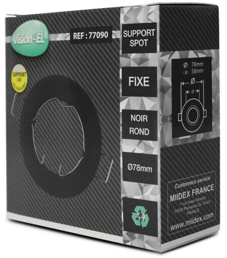 Support de Spot Rond - Certification CE / RoHS - Finition Noir - Diamètre Ø78 mm - diamètre de perçage Ø58 mm Forme : Rond Fixe Ampoule(s) ou tube(s) inclus : Non Finition / Couleur : Noir Matériaux : Aluminium IP (Indice de Protection) : IP20 Diamètre du spot : Ø78 mm Diamètre de perçage : 58 mm Poids : 0,047Kg Certification(s) : CE & RoHS Garantie constructeur (en année(s)) : 2 Batterie(s) ou pile(s) incluse(s) : non Contient du bois : non ...