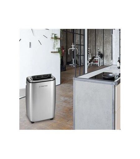 Climatiseur mobile monobloc de 3,8 kW/13.000 Btu pour pièces de 50 m²/125 m³ max.Gris argent, le climatiseur PAC 3810 S sort de l'ordinaire en alliant performance et élégance.Un appareil efficace qui ne vous convainque pas seulement par ses caractéristiques techniques mais également par son design ? Le PAC 3810 S sera à la hauteur. Avec ses 3.800 watts (13.000 Btu/h), vous pourrez l'employer pour climatiser de grandes pièces de 50 m²/125 m³ max., à la maison, dans une boutique, une chambre d'hôtel, une salle de yoga ou un bureau par exemple. Le confort d'utilisation est également au rendez-vous : ce modèle est livré avec une télécommande et est doté d'une minuterie 24 heures ainsi que d'un mode nuit.Le PAC 3810 S est équipé d'un thermostat qui mesure la température de la pièce. Celle-ci s'affiche à l'écran du panneau de commande. La température désirée peut être réglée entre 16 °C et 31 °C. Pour profiter d'une température constante, le compresseur de l'appareil s'éteint dès que la température voulue est atteinte. Il ne se remet en marche que lorsque la température de la pièce dépasse la température voulue. Ce fonctionnement automatique permet à ce climatiseur mobile de classe A de fonctionner en fonction des besoins de façon particulièrement économique ! Le ventilateur à trois vitesses du PAC 3810 S peut être utilisé avec ou sans fonction de climatisation. Grâce à un débit de 450 m³/h, il assure un souffle d'air frais et une bonne circulation de l'air dans la pièce. La fonction d'oscillation activable au besoin permet de répartir l'air frais de façon encore plus homogène. À l'arrière de l'appareil, un filtre à air facile à nettoyer capture les poussières, poils d'animaux et peluches en suspension dans l'air.La déshumidification de l'air, une merveille par temps lourdLa capacité de déshumidification de 1,5 litre par heure de ce climatiseur assure une extraction efficace du trop d'humidité de l'air, qui peut saturer l'air chaud estival. La déshumidification de l'air améliore sensiblement le climat intérieur et prévient le risque de développement de moisissure. Grâce au système de réutilisation de l'humidité recueillie, il n'est que rarement nécessaire de vider le bac à condensats. L'eau de condensation est en effet recyclée et utilisée pour refroidir le condenseur ; la majeure partie s'évapore pendant le processus.Les trois fonctions de climatisation, ventilation et déshumidification peuvent être utilisées indépendamment l'une de l'autre, une particularité qui permet d'utiliser l'appareil toute l'année, non seulement comme climatiseur en été mais aussi comme ventilateur et déshumidificateur pour plus de bien-être.Le confort d'utilisation est un facteur de choix non négligeable. Le climatiseur mobile PAC 3810 S est livré avec une télécommande qui vous permettra de le faire fonctionner à distance et d'avoir accès à toutes les fonctions et réglages sans que vous deviez vous lever. Comme son nom l'indique, vous pourrez utiliser ce climatiseur dans... ...