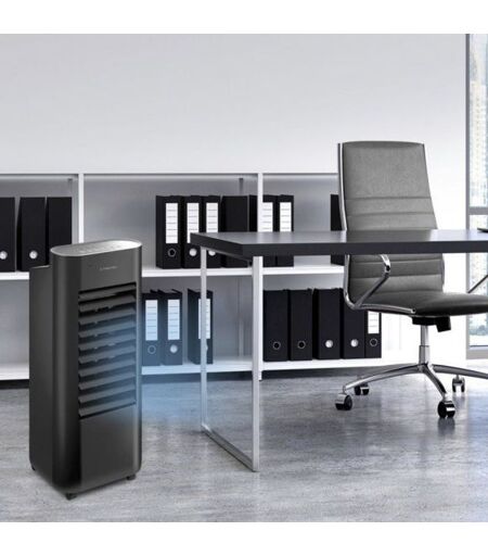 Appareil à fonctions de ventilateur, refroidisseur d'air et humidificateur pour 24 m²/60 m³ max. Le Pae 22 est un rafraîchisseur d'air noir compact offrant non seulement une fonction de refroidissement de l'air mais aussi de ventilation et d'humidification. Ceci permet de l'utiliser toute l'année. Il convient pour les pièces de 24 m²/60 m³ max. - parfait pour le bureau ou la maison. Le phénomène de refroidissement de l'air se produit de façon naturelle par évaporation d'eau sans qu'aucun réfrigérant chimique ne soit nécessaire. En outre, ce refroidisseur d'air 3 en 1 présente l'avantage de filtrer les poussières, peluches et/ou poils d'animaux en suspension dans l'air à l'aide d'un filtre à air intégré. Points forts et détails pratiques de ce modèle : Rafraîchisseur d'air 3 en 1 à effet de froid par évaporation et fonction de ventilation et d'humidification de l'air Rafraîchissement naturel de l'air grâce au principe d'évaporation et au filtre en nid-d'abeilles Utilisable avec des glaçons ou des accumulateurs de froid (deux fournis) pour une fraîcheur plus intense Évaporation élevée de 0,9 litre par heure Bac de 6 litres, indication du niveau de remplissage Oscillation automatique des volets de sortie d'air pour une répartition efficace de l'air frais Filtre à air capturant les poils d'animaux, les peluches et les poussières Mode vent naturel : simule une brise variant en intensité Mode nuit : vitesse de ventilation réduite Avec télécommande pour un plus grand confort d'utilisation 4 vitesses de ventilation Fonction d'horloge sur 15 heures permettant de programmer la mise en marche et l'arrêt de l'appareil Facile à déplacer grâce à sa poignée moulée et ses roulettes Utilisable toute l'année : en été comme rafraîchisseur d'air, en hiver comme humidificateur Bon à savoir : une élévation du taux d'humidité de l'air à 50 % réduit le risque de transmission des virus. Des spécialistes se sont intéressé à la résistance des virus (SARS-CoV, Mers-coV et Sars-coV-2 (Covid-19), influenza) en fonction des conditions d'humidité de l'air. Leur étude a montré que le taux d'humidité jouait un rôle essentiel sur le caractère infectieux des germes. À un taux d'humidité relatif inférieur à 40 %, l'air intérieur sec fait sécher les gouttelettes de taille infime chargées de virus de grippe ou de rhume. Ceci donne lieu à la conservation des agents pathogènes et à une longue survie de ces derniers. Dans une plage de 40 à 60 % d'humidité relative, les aérosols ne s'atrophient que dans une certaine mesure ; à ce taux d'humidité, la concentration en sels augmente dans le noyau, les germes et micro-organismes qui y sont présents meurent. ...