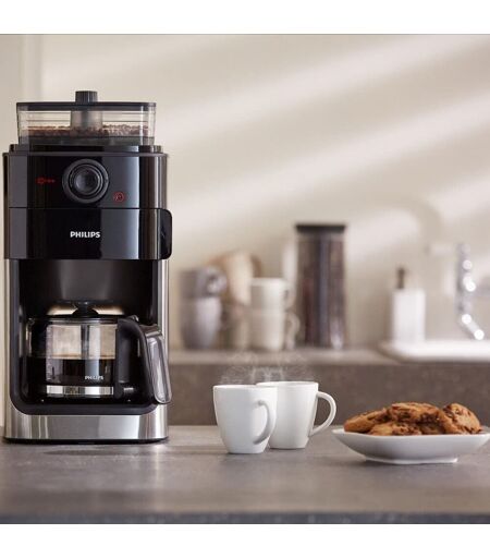 Savourez un excellent café préparé avec des grains de café fraîchement moulus, grâce à la cafetière Philips Grind & Brew avec broyeur intégré. Le sélecteur d'intensité vous permet de régler l'intensité de votre café.La buse intelligente à l'intérieur de la verseuse mélange parfaitement le café afin d'obtenir un arôme optimal et homogène, de la première à la dernière tasse.Pour obtenir ce goût délicieux de café fraîchement moulu, les grains de café frais sont moulus juste avant la préparation du café. Cette cafetière est dotée d¿un broyeur conique permettant d'obtenir une finesse de mouture optimale, pour une saveur inégalée.Réglez l'intensité de votre café : léger, moyen ou fort.Vous pouvez également utiliser du café moulu plutôt que des grains de café. La fonction d'arrêt de la mouture désactive le broyeur. Vous n'avez plus qu'à remplir le filtre de café moulu.Personnalisez le goût de votre café en choisissant l'une des 9 options de mouture proposées. Sélectionnez une mouture fine pour obtenir un café fort ou une mouture plus grosse pour un café filtre léger.Pratique, le bouton de contrôle vous permet de sélectionner et de personnaliser facilement votre réglage de café préféré, dont par exemple le nombre de tasses et l'intensité du café.Choisissez combien de temps vous souhaitez maintenir votre café chaud après sa préparation. L'arrêt automatique est réglable de 10 minutes à 2 heures.Le système stop-gouttes vous permet de vous servir une tasse de café avant la fin du cycle complet de préparation du café.Remplissez le réservoir d'eau facilement et avec exactitude grâce à l'indicateur du niveau d'eau. ...