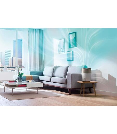 Pendant l'automne et l'hiver particulièrement, le taux d'humidité de votre pièce joue un grand rôle. Selon les spécialistes, le taux d'humidité recommandé se situe entre 40% et 60%, un taux difficile à atteindre l'hiver lorsque les chauffages sont allumés. Cet air sec peut sérieusement nuire à la santé, surtout chez les personnes les plus sensibles comme les nourrissons et les jeunes enfants: dessèchement des yeux et du nez, apparition de rhumes et de désagréments respiratoires...Avec les produits Philips, respirez la différence et profitez d¿un air plus sain en permanence !Philips en tant que marque leader dans le domaine de la santé et du bien-être, a développé une gamme d'humidificateurs et de purificateurs d'air pour vous aider à vous protéger ainsi que vos proches de ces substances polluantes intérieures et de profiter d'un environnement plus sain. L'humidificateur HU4803/01 de Philips est un humidificateur d¿air très facile à utiliser et permet d¿améliorer sensiblement la qualité de l¿air de votre intérieur.L'humidificateur HU4803/01 est doté d'un système d'évaporation naturelle NanoCloud en trois étapes: Etape 1 - le filtre absorbant piège les grandes particules telles que la poussière et les poils humains ou d'animaux en aspirant l'air sec. Etape 2 - le système d'évaporation NanoCloud introduit des molécules d'eau dans l'air pour humidifier, sans bactéries ni calcaire. Etape 3 - l'air sain est rejeté de l'humidificateur à une vitesse constante, pour un air humidifié sain et agréable dans votre maison, sans formation de gouttelettes d'eau.L'air humidifié est diffusé de façon homogène dans toute la pièce (couvre une surface jusqu'à 25 m2). Respirez et dormez mieux à la maison grâce à un air plus sain.En mode automatique, le capteur numérique contrôle en permanence l'humidité de l'air et active l'humidificateur si nécessaire, pour un taux d'humidité toujours au bon niveau.Rien de plus facile à nettoyer, à l'intérieur comme à l'extérieur!Vous pouvez remplir le réservoir d'eau de l'humidificateur Philips de 2 façons: en remplissant un récipient d'eau et en versant son contenu dans le réservoir débarassé de son couvercle, ou en portant le réservoir d'eau jusqu'au robinet le plus proche.L'humidificateur d'air HU4803/01 vous permet de choisir entre 40, 50 et 60% d'humidité dans l'air, pour un confort optimal.L'humidificateur HU4803/01 est doté d'un filtre de qualité supérieure qui empêche le rejet de calcaire, de bactéries, de microbes et de moisissures dans l'air. Vous pouvez remplacer le filtre 3 à 12 mois après utilisation en fonction de votre usage.Lorsque le réservoir d'eau est vide et qu'il doit être rechargé, le verrouillage de protection de la qualité de l'air éteint l'humidificateur et un voyant rouge s'allume pour vous prévenir que l'humidificateur est arrêté. ...