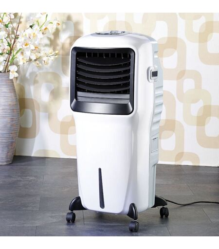Ventilateur sur pied avec vaporisateur, ioniseur et télécommande Dites stop aux pièces trop chaudes ou sèches. Avec un volume d'air expulsé de 550 m³ par heure, ce ventilateur avec vaporisateur apporte un rafraîchissement agréable même au c?ur de l'été. Grâce au filtre à rayons, ce rafraîchisseur d'air crée une évaporation de l'eau qui permet non seulement de rafraîchir l'air mais également d'augmenter le taux d'humidité de la pièce. La fonction Ionisation permet en outre de lutter contre le développement de virus, champignons, acariens et odeurs. Restez de longues heures au frais Grâce au minuteur 8 heures, vous pouvez déterminer la durée de fonctionnement du rafraîchisseur. C'est idéal dans un bureau, une chambre ou un atelier : à la fin de la journée de travail ou au cours de la nuit, il s'éteint automatiquement. Monté sur roulettes, ce rafraîchisseur mobile XXL vous suivra de pièce en pièce. Notre astuce : pour un rafraîchissement optimal, choisissez de l'eau froide ou de la glace pour remplir le réservoir. Ventilateur rafraîchisseur d'air à eau avec ioniseur : LW-550 par Sichler 3 vitesses de ventilation, panneau de commandes à LED Minuteur : 1 à 8 heures Direction du souffle d'air réglable Volumes de vaporisation d'eau : 400 ml / heure Volumes d'air : 550 m³ / heure Vitesse max. du flux d'air : env. 10,5 m / s Puissance : 180 W Alimentation : 230 V (longueur du câble : 150 cm) Réservoir d'eau 20 litres Dimensions : 38 x 92 x 33 cm, 9 kg Ventilateur vaporisateur livré avec télécommande, 4 pieds à roulette, matériel de montage Également pertinent ou approprié pour : climatiseur. ...