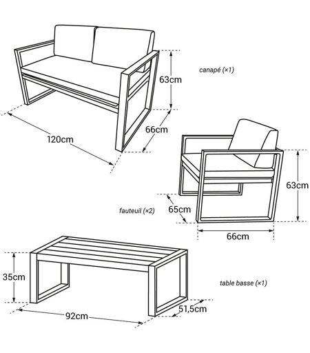 Description : Le salon de jardin IBIZA avec son canapé deux places et ses deux fauteuils pourra accueillir jusqu'à 4 personnes autour de sa table basse. Grâce aux coussins rembourrés et aux accoudoirs, vous serez confortablement installés dans cet ensemble de jardin. Son design épuré et ses couleurs intemporelles s'adapteront à toutes les décorations. La structure des éléments est en aluminium pour assurer longévité et résistance face aux conditions extérieures. Enfin, le salon de jardin IBIZA est facile à entretenir, une éponge et de l'eau savonneuse suffiront. Détails : Dimensions : - Canapé : P 66 × l 120 × H 63cm - Fauteuil : P 66 × l 65 × H 63cm - Hauteur d'assise : 37,5cm - Épaisseur des accoudoirs : 5cm - Hauteur des accoudoirs : 63cm - Coussins d'assise : L 110 × l 66 × Ép. 5 cm (canapé) / L 55 × l 66 × Ép. 5 cm (fauteuil) - Pieds : L 50 × l 23 × Ép. 1,2mm - Table basse : L 92 × l 51,5 × H 35cm Matières : - Structure : aluminium - Coussins : polyester, rembourrage coton - Plateau : verre trempé Couleurs : - Structure : anthracite - Coussins : gris - Plateau : transparent Informations complémentaires : - Nombre de places maximum : 4 - Poids maximum supportés : 220kg (canapé) / 120kg (fauteuil) / 80kg (table basse) - Fauteuils et table : résistant à l'eau et aux U.V - Coussins : déhoussables par zip, lavage à la main avec de l'eau et du savon doux - À monter (notice incluse) - Garantie : 2 ans Livraison : Le salon de jardin IBIZA contient : 1 canapé, 2 fauteuils, 1 table basse Livraison effectuée en pas de porte, en bas d'immeuble - Livraison en 1 colis Colis 1 : L 129 × l 71 × H 47cm - poids brut : 31,5kg/poids net : 28kg ...