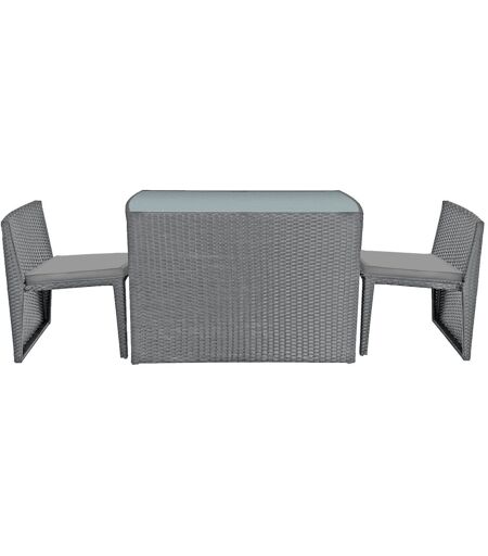 Description Description : Adoptez ce salon de jardin de la gamme SANTORIN, que vous ayez une grande terrasse ou un petit espace. Vous pourrez gagner de la place où que vous l'installiez car les sièges peuvent se glisser sous la table rectangulaire de manière à constituer un bloc. Un salon de jardin encastrable donc, qui ne lésine pas sur son apparence. Avec sa conception en résine tressée, il offre un côté naturel chic à tout type de jardin ou de terrasse, quel que soit le style de déco. Ses 2 fauteuils comportent des coussins rembourrés pour plus de confort et sont déhoussables, afin d'en faciliter le lavage en machine. Résistant à l'eau et aux U.V., ce salon de jardin 2 places garde son aspect des premiers jours. Détails : Dimensions : - Chaise : L 55 × P 55 × H 68cm - Hauteur d'assise : 41cm - Table : L 112 × l 62 × H 74cm - Épaisseur du plateau : Ép. 5mm - Coussins d'assise : L 50 × l 50 × Ép. 5cm Matières : - Revêtement : résine tressée - Structure : acier - Plateau : verre - Coussins : polyester, rembourrage mousse Couleurs : - Revêtement : gris - Coussins : gris - Plateau : transparent ... Informations complémentaires : - Nombre de places maximum : 2 - Poids maximum supportés : 150kg (chaise) / 80kg (table) - Fauteuils, table et coussins : résistant à l'eau et aux U.V - Coussins : déhoussables par zip, lavage en machine - Livré monté Voir plus ...