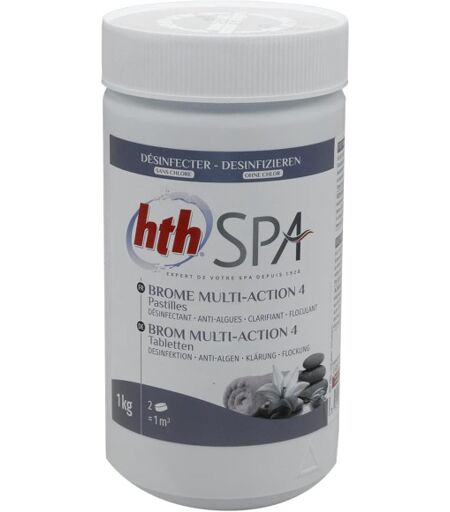 Brome Multi-Action 4 : le meilleur traitement pour votre spa Votre spa, de par son agitation, son faible volume d'eau et sa température élevée nécessite beaucoup d'attention afin de préserver une qualité optimale de l'eau. En choisissant ce Brome hth, spécialement conçu pour le traitement des spas, vous assurerez, facilement et efficacement, le traitement intégrale de votre bassin. Atouts du Brome 4 actions 4 en 1 : désinfection - anti-algues - clarifiant - floculant Produit chimique efficace même à pH élevé à l'inverse du chlore. Garanti sans chlore, le brome Multi-Action 4 est inodore et n'agresse pas la peau. Entretien & Consignes d'utilisation A la mise en route, ajoutez 2 pastilles par m3 d'eau. Analysez régulièrement la teneur en brome de votre eau. Ajustez pour maintenir une teneur en brome au minimum égale à 4 mg/l. Les pastilles doivent être placés dans un skimmer ou un diffuseur flottant. Utilisez les produits chimiques de traitement d'eau avec précaution. Avant toute utilisation, lisez les consignes inscrites sur l'emballage du produit et rendez-vous sur le site officiel du fabricant depuis notre page dédiée à la marque hth® ...