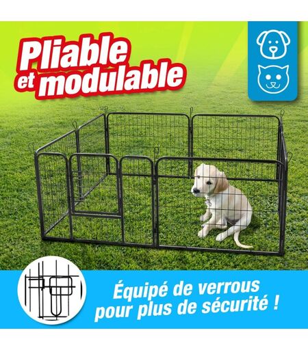 Enclos pour chiens ou autres animaux type lapin Enclos en métal noir pour animaux de compagnie amovible et modulaire de taille 80x60 cm par 8 parois est idéal, très pratique et confortable. Sa surface et son cote modulable permet d'optimiser en fonction de l'endroit où on le pose. Il permettra d'accueillir tout le nécessaire de confort pour vos animaux tels que, coussins, paniers, jouets Equipe de verrou pour garantir la sécurité de vos animaux. Facile à installer et à replier pour un gain de place. Poids de cet enclos : 14kg Hauteur de l'enclos 60cm, la largeur de chaque porte est de 80cm pour 8 portes au total usage intérieur ou extérieur ...