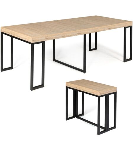 Table console extensible effet bois et métal Console extensible avec 4 rallonges intégrées de style industriel : optez pour le meuble tout en 1 ! Passe de 47 à 235 cm ! Selon le nombre de rallonges que vous ajoutez à votre table console modulable, cette dernière se transforme en petite table d'appoint ou en grande table de réception pouvant accueillir jusqu'à 10 personnes ! Avec cette table console extensible , vous gagnez de la place, tout en vous assurant d'avoir à portée de main un meuble adapté à tous vos besoins . Astucieuse, cette console à rallonges au design industriel apporte également une touche de modernité à votre entrée, votre salon ou même dans votre chambre, pour faire office de petit bureau d'appoint. Informations techniques Matière : particules de bois et métal. Dimensions en version pliée : L. 90 x l. 47 x H. 75 cm. en version dépliée complètement : L. 90 x l. 235 x H. 75 cm. de chaque rallonge : L. 90 x l. 47 x ép. 7,5 cm. hauteur sous plateau : 68 cm. Coloris : ...