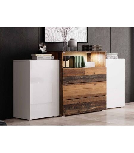 DESCRIPTION GÉNÉRALE Buffet avec 3 compartiments, 2 portes et 3 tiroirs, en blanc laqué et bois vieilli. Design moderne avec un espace de rangement tendance à petit prix. SPÉCIFICATIONS TECHNIQUES Nombre de compartiments : 3 Nombre de portes : 2 Nombre de tiroirs : 3 Couleur : blanc laqué et bois vieilli ...