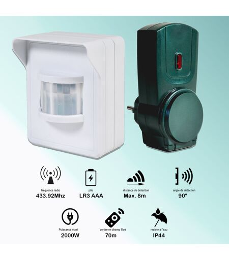 Kit d'éclairage extérieur - détecteur de mouvement sans fil et prise connectée Découvrez ce kit détecteur de mouvement et prise connectée qui vous permettra de gérer votre éclairage par simple détection de mouvement. DESCRIPTIF : - Type de produit : Détecteur de mouvement et prise télécommandée - Marque : Blyss - Type d'usage : Extérieur - Coloris : Blanc - Kaki CARACTERISTIQUES TECHNIQUES : Détecteur de mouvement - Alimentation : 2 piles LR3 AAA (non fournies) - Fréquence radio : 433.92 MHz - Angle de détection : 90° - Distance de détection : 8m - Type de fixation : Montage en saillie - Support orientable : Oui - Indice de protection : IP44 Prise télécommandée - Alimentation : 230V - Puissance max : 2000W - Fréquence radio : 433.92 MHz - Portée en champs libre : 70m - Indice de protection : IP44 CE QUE NOUS AIMONS : - Simple d'utilisation et facile à installer - Le détecteur de mouvement allume l'éclairage branché sur la prise télécommandée dès qu'il détecte un mouvement. ...
