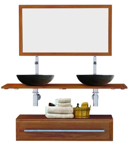 SANITECK Ensemble meuble tiroir vasques et miroir salle de bain Eleganzia 130 cm en bois teck naturel Taille - Meuble + miroir + 1 vasque