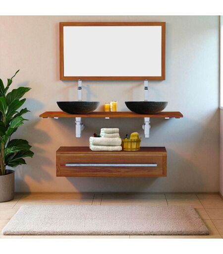 SANITECK Ensemble meuble tiroir vasques et miroir salle de bain Eleganzia 130 cm en bois teck naturel Taille - Meuble + miroir sans vasque