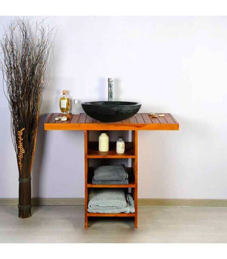 Meuble salle de bain New Gempo en bois teck 100 Cm Détails du meuble New Gempo : Matière : Teck massif Finition : Vernis léger résistant à l?humidité Dimensions du meuble : L100 x P50 x H80 cm Dimensions du miroir : L45 x P2 x H68 cm Plateau supérieur : Teck gravé à la main (motif caillebotis) Rangement : 1 colonne latérale 3 étagères ouvertes en teck massif Caractéristiques de la vasque en Terrazzo : Matière : Terrazzo (mélange de ciment indonésien et marbre concassé) Coloris : Noir profond Diamètre : 44 cm Hauteur : 13 cm Poids : 9 kg Un meuble zen, pratique et esthétique Le meuble New Gempo reprend l?esprit japonais de la collection Gempo originale, en y ajoutant une colonne latérale pour un rangement vertical optimisé. Les gravures artisanales du plateau rappellent les caillebotis traditionnels, soulignant le raffinement discret de ce design. Conçu en teck massif, il résiste naturellement à l?humidité. Sa finition vernie légère protège le bois tout en mettant en valeur son veinage ...