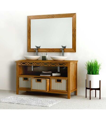 Ensemble meuble vasque salle de bain Attessam 140 avec miroir Détails de l?ensemble meuble salle de bain Attessam et des vasques : MEUBLE : Matière et couleur : Teck massif naturel Dimensions du meuble : L140 x P55 x H80 cm Tiroirs : 3 tiroirs en rotin tressé Plan vasque : Non percé ? compatible 1 ou 2 vasques Accessoires inclus : Porte brosse à dents et porte bougie (voir photo) Dimensions du miroir : L130 x H90 x P4 cm VASQUES : Type : Rondes / à poser Matière : Terrazzo (mélange de ciment indonésien et de marbre concassé) Diamètre : 44 cm / Hauteur : 13 cm Poids unitaire : 9 kg Pré-percées : Oui ? trou de bonde standard international Sans trop-plein Un ensemble de salle de bain au contraste chic et contemporain L?ensemble Attessam, avec ses lignes naturelles et ses matériaux haut de gamme, est sublimé ici par deux vasques rondes en Terrazzo, qui ajoutent une touche de caractère audacieuse à votre salle de bain. Le teck massif naturel, chaleureux et durable, se marie parfaitement ...