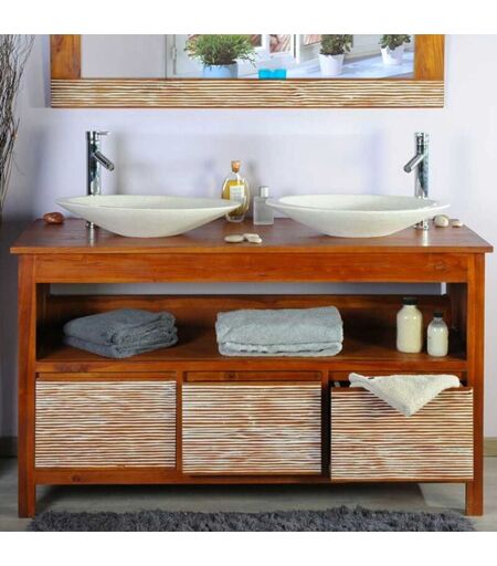 Ensemble meuble salle de bain 140 cm en bois Teck naturel MEUBLE : Matière : Teck exotique Naturel pour un effet patiné et chaleureux Dimensions du meuble : L140 x P55 x H80 cm Poids du meuble : 55 kg Rangements : 2 portes + 1 étagère centrale ouverte Plan vasque : Non percé ? compatible avec 2 vasques à poser Dimensions du miroir : L130 x H85 cm Poids du miroir : 8 kg VASQUES à poser : Matière vasques : Terrazzo (ciment indonésien + marbre concassé) Coloris : Blanc pigmenté Forme : Ovale Dimensions de chaque vasque : L57 x l35 x H13 cm Poids unitaire : 9 kg Origine : Fabrication française COLONNE : Matière et couleur : Teck Naturel Finition : Vernis cellulosique (finition claire) Dimensions : Hauteur 180 cm ? Largeur 50 cm ? Profondeur 35 cm Poids : 35 kg Rangements : 3 niches ouvertes + 1 tiroir bas PANIERE A LINGE : Dimensions : L45 x P40 x H80 cm Matière : Teck Équipement : Niche de rangement + panière à linge basculante Fonction : Rangement du linge ou des serviettes, complément ...