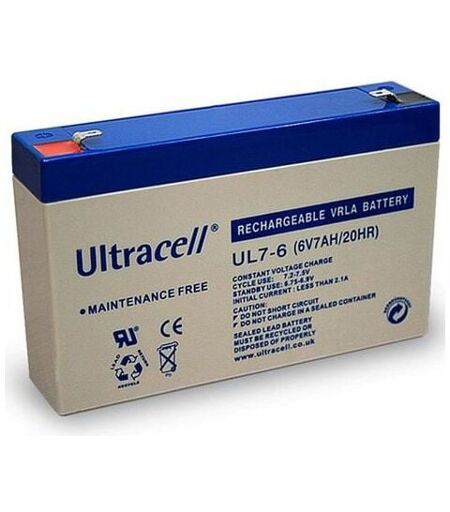 Batterie plomb étanche - Ultracell UL7-6 Batterie VRLA scellée sans entretien pour application jouets enfants / alarme / portail électrique / onduleur. Caractéristiques : - Application : Batterie onduleur, Batterie modélisme, Batterie biomédicale, Batterie jouet, Batterie alarme ; - Voltage (V) : 6 ; - Capacité de batterie (ah) : 7 ; - Longueur (mm) : 151 mm ; - Profondeur (mm) : 34 mm ; - Hauteur (mm) : 100 mm ; - Poids (kg) : 1.10 kg ; - Entretien : Sans entretien ; - Gamme : UL ; - Polarité : Polarité +- ; - Position Borne + (face à vous) : Gauche ; - Technologie : VRLA (plomb acide) ; - Type de bac (listeaux) : ABS (UL94:HB). ...