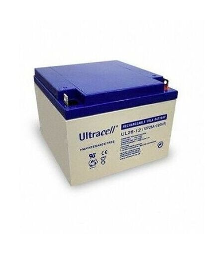 Batterie plomb étanche - Ultracell UL26-12 Batterie VRLA scellée sans entretien pour application jouets enfants / alarme / portail électrique / onduleur. Caractéristiques : - Application : Batterie fauteuil roulant, Batterie jouet, Batterie modélisme, Batterie alarme, Batterie biomédicale, Batterie onduleur, Batterie vélo électrique ; - Voltage (V) : 12 ; - Capacité de batterie (ah) : 26 ; - Longueur (mm) : 166.5 mm ; - Profondeur (mm) : 175 mm ; - Hauteur (mm) : 125 mm ; - Poids (kg) : 8 kg ; - Entretien : Sans entretien ; - Gamme : Ultracell ; - Polarité : Polarité -+ ; - Position Borne + (face à vous) : Droite ; - Technologie : VRLA (plomb acide) ; - Type de bac (listeaux) : ABS (UL94:HB). ...