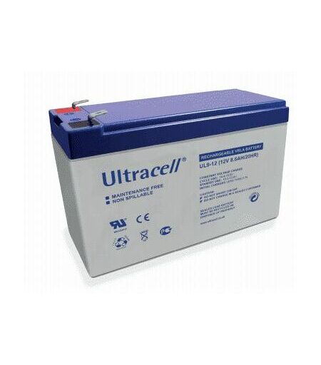 Batterie plomb étanche - Ultracell UL9-12 Batterie VRLA scellée sans entretien pour application jouets enfants / alarme / portail électrique / onduleur. Caractéristiques : - Application : Batterie onduleur, Batterie modélisme, Batterie biomédicale, Batterie jouet, Batterie alarme ; - Voltage (V) : 12 ; - Capacité de batterie (ah) : 9 ; - Longueur (mm) : 151 mm ; - Profondeur (mm) : 65 mm ; - Hauteur (mm) : 99 mm ; - Poids (kg) : 2.4.5 kg ; - Entretien : Sans entretien ; - Gamme : UL ; - Polarité : Polarité à gauche ; - Position Borne + (face à vous) : Sur le Côté ; - Technologie : VRLA (plomb acide) ; - Type de bac (listeaux) : ABS (UL94:HB). ...
