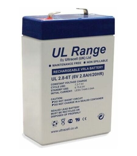Batterie plomb étanche - Ultracell UL2.8-6 Batterie VRLA scellée sans entretien pour application jouets enfants / alarme / portail électrique / onduleur. Caractéristiques : - Application ; Batterie onduleur, Batterie modélisme, Batterie biomédicale, Batterie jouet, Batterie alarme ; - Voltage (V) : 6 ; - Capacité de batterie (ah) : 2.8 ; - Longueur (mm) : 134 mm ; - Profondeur (mm) : 34 mm ; - Hauteur (mm) : 66 mm ; - Poids (kg) : 0.57 kg ; - Entretien : Sans entretien ; - Gamme : UL ; - Polarité : Polarité +- ; - Position Borne + (face à vous) : Gauche ; - Technologie : VRLA (plomb acide) ; - Type de bac : (listeaux) ABS (UL94:HB). ...