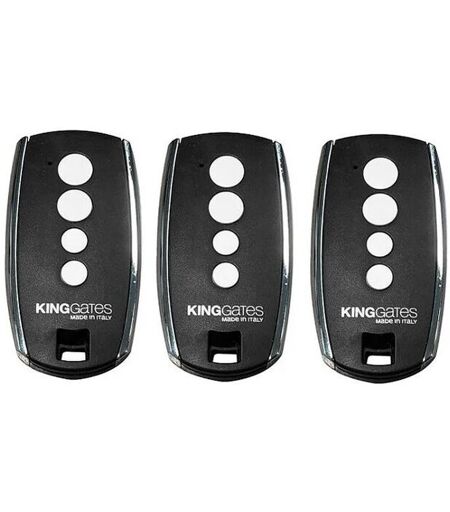 Lot de 3 télécommandes KING GATES Stylo 4K noire touches blanches, 4 boutons, de fréquence 433,92 Mhz Stylo 4K est un émetteur radio rolling code 433.92 MHz à quatre canaux au design recherché. La version 4K à quatre canaux a une coque en métal chromé particulièrement résistante. ATTENTION : Vérifiez que cette télécommande est compatible avec votre système. Assurez-vous que celui-ci est de la même fréquence ! Si vous habitez en copropriété, vous ne pourrez pas programmer la télécommande sans votre syndic. Caractéristiques : - Fréquence : 433,92 MHz ; - Portée : 100 m ; - Codification : Rolling code ; - Alimentation : 3 Vcc ; - Courant absorbé : 10 mA ; - Dimensions : 70x38x10 mm. ...