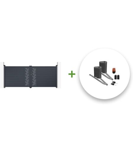 Ce pack de portail motorisé contient : Portail battant design ARLBERG gris Largeur 350cm et Hauteur 145cm Motorisation à vis sans fin (jusqu'à 400kg) Casanoov est spécialisé dans les portails et portillons en KIT, à asssembler et à poser soi-même Portail alu battant 3,5m ARLBERG 350B140 Le portail battant ARLBERG au design graphique apporte modernité et élégance à votre entrée Description : Portail battant droit semi-ajouré, deux vantaux égaux Matériau : Aluminium Coloris : Gris anthracite RAL 7016 Type de Motif : "Ligne graphique" Dimensions : Largeur 350 cm x Hauteur 145 cm Largeur nécessaire entre piliers : 355cm Hauteur minimum des piliers : 160 cm Inspiré et designé en France Ce kit de portail à monter et à installer par vous-même contient : - 14 lames en aluminium (Hauteur 16 cm) - 2 lames en aluminium renforcées pour motorisation (Hauteur 16 cm) - 2 plaques décoratives en aluminium motif "Ligne graphique" (épaisseur 20/100) - 2 gonds supérieurs montés sur roulement à billes - 2 ...