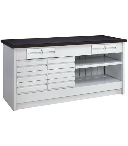 Banque comptoir modèle 8 tiroirs avec > 1 tablette fixe (Dim. utiles de la tablette : L. 905 x P. 550 mm.) > 2 tiroirs avec fermeture à clé. (Dim. L. 415 x P. 435 x H. 100 mm) > 1 bloc de 6 tiroirs > Plateau épaisseur 40 mm avec dessus caoutchouc gommé avec bordure finition caoutchouc. > Structure métallique. Finition peinte coloris Gris RAL 7035. Dimensions : > Hors tout banque : L.2015 x P.700 x H. ...