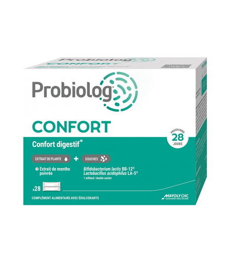 Probiolog® CONFORT qui contient un extrait de menthe poivrée qui aide à une bonne digestion, permettant ainsi un bien être digestif et de 2 souches microbiotiques Bifidobacterium animalis subsp. lactis BB-12 et Lactobacillus acidophilus LA-5. ...