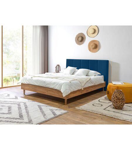 Lit OLYMPE tête de lit avec rangement lattes massives et pieds en bois naturel bleu 160x200 BOBOCHIC 160x200