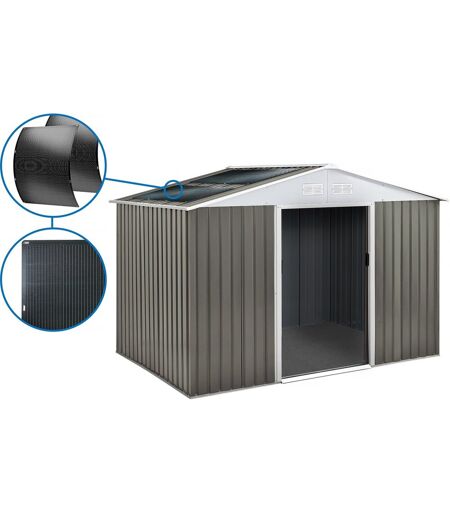 Habitat et Jardin Abri de jardin métal - Couleurs gris/taupe et blanc - Dimensions hors tout 3,19 m x 3,4 m x 2,10 m- Epaisseur des parois : 0,025 m - Structure haute qualité composée de zinc et d'acier - 2 portes coulissantes - 4 grilles d'aérations- 2 p