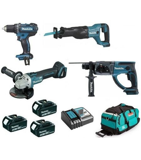 DESCRIPTION GÉNÉRALE Pack premium MAKITA 18V de 4 machines avec 3 batteries 5Ah comprenant : une perceuse visseuse, une meuleuse angulaire, un perforateur-burineur et une scie récipro. Le pack inclut également un chargeur rapide et un sac à outils. SPÉCIFICATIONS TECHNIQUES Perceuse visseuse 18V 62Nm DDF482 : Couple de serrage max. : 36 / 62 Nm, 2 vitesses, 21 positions de couple, Vitesse à vide : 0 à 600 / 0 à 1 900 tr/min, Ø max. dans acier/bois : 13 / 38 mm, Poids : 1,7 kg. Meuleuse angulaire 18V Ø 125mm DGA504 : Vitesse à vide maxi : 8 500 tr/min, Capacité de coupe maxi : 20 mm, Diamètre du disque : 125 mm, Poids : 2,5 kg. Perfo-burineur SDS-Plus 18V 2J 20mm DHR202 : 3 fonctions, Puissance de frappe : 2 Joules, Diam. max. dans béton/acier/bois : 20 / 13 / 26 mm, Vitesse à vide : 0 à 1 200 tr/min, Poids : 3,5 kg. Scie récipro 18V 530W DJR186 : Puissance de sortie : 530 W, Cadence de coupe maximale : 2 800 cps/min, Longueur de course : 32 mm, Capacité de coupe bois/tube acier : 255 ...