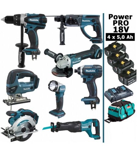 Pack Power PRO MAKITA 18V 8 outils 4 batt 5Ah comprenant: - 1 Perceuse visseuse 18V 91Nm DDF458 - 1 Perfo-burineur SDS-Plus 18V 2J 20mm DHR202 - 1 Meuleuse angulaire 18V Ø 125mm DGA504 - 1 Visseuse à chocs 18V 165Nm DTD152 - 1 Scie sauteuse 18V 26mm DJV180 - 1 Scie circulaire 18V 165 mm DSS610 - 1 Scie récipro 18V 530W DJR186 - 1 Lampe Torche LED 180lm DEADML802 - 4 Batteries 5,0 Ah BL1850B avec témoin de charge (Li-Ion 18 V - 5 Ah) - 1 Chargeur double rapide DC18RD - 1 sac outillage à roulettes Perceuse visseuse 18V 91Nm DDF458 : Nombre de vitesses : 2 Vitesse à vide V1/V2 : 0 à 400 / 0 à 2 000 tr/min Couple de serrage max. (élast/franc) : 58 / 91 Nm Ø max. dans acier / bois : 13 / 76 mm Poids net : 2,3 kg Puissante et Compacte. Protection du moteur contre la poussièreGâchette à variateur de vitesse pour une amorce facile de la vis. Éclairage LED intégré pour un travail plus aisé dans les endroits sombres. Perfo-burineur SDS-Plus 18V 2J 20mm DHR202 : 3 fonctions : perçage, ...