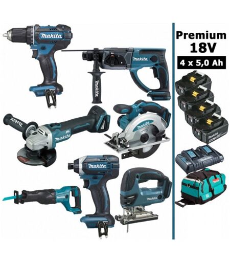 Makita - Pack 7 machines 18V 5Ah: Perceuse DDF482 + DTD152 + DGA504 + DHR202 + DJR186 + DJV180 + DSS610 + 4 batteries + sac