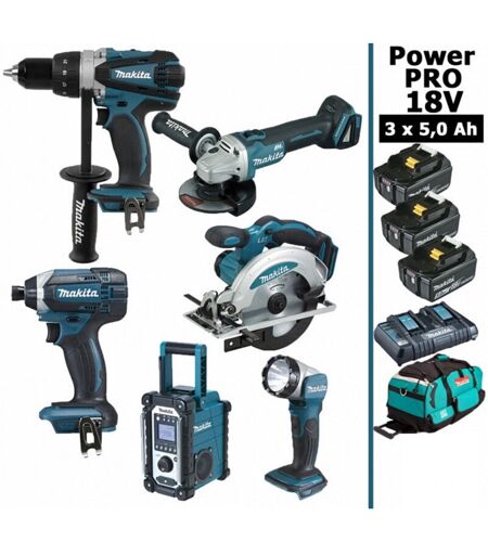 Makita - Pack Power pro 6 outils 18V: Perceuse DDF458 + Visseuse à choc DTD152 + Meuleuse DGA504 + Scie circulaire DSS610 + Radio