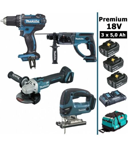 Makita - Pack Premium 4 machines 18V 5Ah: Perceuse DDF482 + Meuleuse DGA504 + Perforateur DHR202 + DJV180 + 3 batteries + sac