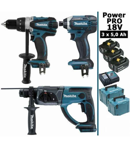 DESCRIPTION GÉNÉRALE Pack Power PRO MAKITA 18V comprenant 3 outils et 3 batteries 5Ah : Perceuse visseuse 18V 91Nm DDF458 Perfo-burineur SDS-Plus 18V 2J 20mm DHR202 Visseuse à chocs 18V 165Nm DTD152 3 Batteries 5,0 Ah BL1850B Chargeur rapide DC18RC 2 Coffrets Makpac SPÉCIFICATIONS TECHNIQUES Perceuse visseuse 18V 91Nm DDF458 : 2 vitesses, 0 à 400 / 0 à 2 000 tr/min, couple max. 58 / 91 Nm, Ø max. acier/bois 13 / 76 mm, poids 2,3 kg Perfo-burineur SDS-Plus 18V 2J 20mm DHR202 : 3 fonctions, puissance de frappe 2 Joules, Ø max. béton/acier/bois 20 / 13 / 26 mm, vitesse à vide 0 à 1 200 tr/min, poids 3,5 kg Visseuse à chocs 18V 165Nm DTD152 : couple 165 Nm, vitesse à vide 0 à 2 900 tr/min, poids 1,5 kg Garantie 1 an (3 ans pour les machines, 2 ans pour les batteries et chargeurs si enregistrés) ...