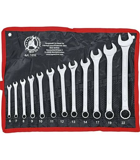 Assortiment de 12 clés mixtes (plates et ?il) en acier chrome-vanadium de 6 à 22 mm. De marque BGS DIY, pour un usage intensif. Dimensions : 6 - 7 - 8 - 9 - 10 - 11 - 12 - 13 - 14 - 17 - 19 et 22 mm. Lot conditionné dans un sac roulé tétron (fibre polyester), avec oeillets de fixation. ...
