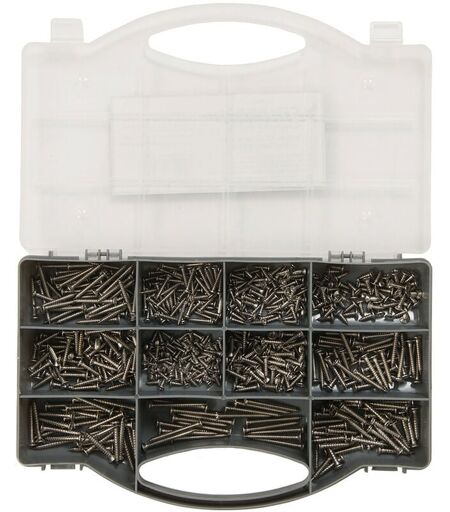 Coffret de 570 vis en inox A2 auto-taraudeuses et à tête fraisée. Vis cruciformes Pozidriv pour une multitude d'applications dans la maison, l'atelier et le garage. Dimensions : 3/8" x 4 1/2" x 4 3/4" x 4 1/2" x 6 5/8" x 6 3/4" x 6 1" x 6 1-1/4" x 6 1" x 8 1-1/4" x 8 1-1/2" x 8 Coffret compartimenté très pratique de 570 pièces. ...