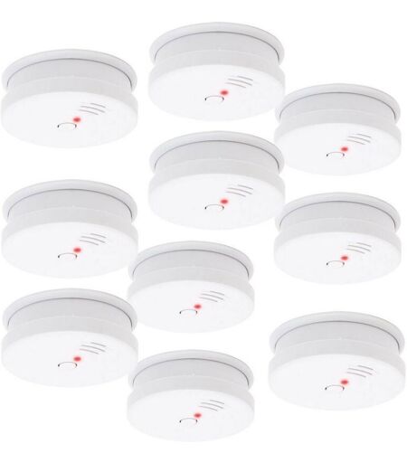 Lot de 10 appareils de détection de fumée à capteurs optiques pour une installation sans câble Préviennent du feu dans la maison ou dans les locaux professionnels. Descriptif : bouton de test et ton d'alerte de faible charge alarme avec volume de 85dB en cas de développement de fumée fonctionnent avec une pile 9V fournie certifiés DIN EN 14604 ...