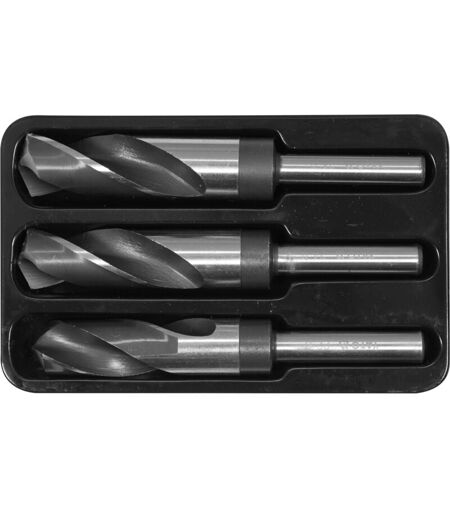 LOT DE 3 FORETS HSS A METAUX 22-24-25 mm Forets de 22, 24 et 25 mm HSS 4241 à queue réduite à 13 mm pour le perçage des aciers, acier alliés et tous métaux. Ce type de mèche permet le perçage de trous de grandes dimensions tout en étant monté sur un mandrin de perceuse standard jusqu'à 13 mm. Queues de forets réduite au diamètre de 13 mm. En acier HSS. 4241 Dimensions de 22, 24 et 25 mm. ...