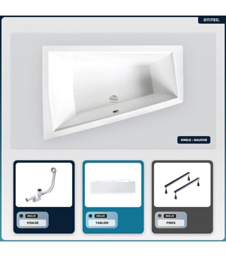 Otitec - Baignoire asymétrique - 180 x 125 cm - Gauche - avec Tablier - Pieds - Vidage Chrome - intima duo