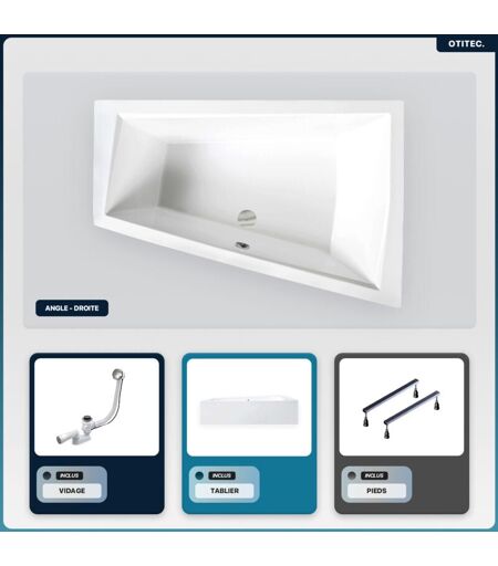 Otitec - Baignoire asymétrique - 170 x 125 cm - Droite - avec Tablier - Pieds - Vidage Chrome - intima duo