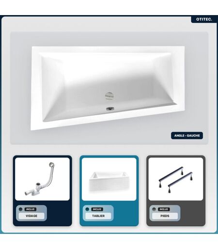 Otitec - Baignoire asymétrique - 160 x 90 cm - Gauche - avec Tablier - Pieds - Vidage Chrome - intima