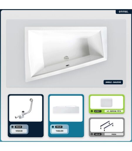Otitec - Baignoire asymétrique - 170 x 125 cm - Gauche - avec Tablier - Pieds - 2 Repose-têtes - Vidage Chrome - intima duo