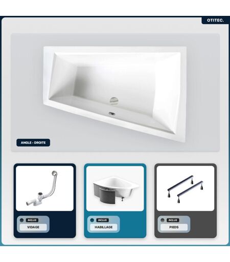 Otitec - Baignoire asymétrique - 180 x 125 cm - Droite - avec Habillage - Pieds - Vidage Chrome - intima duo