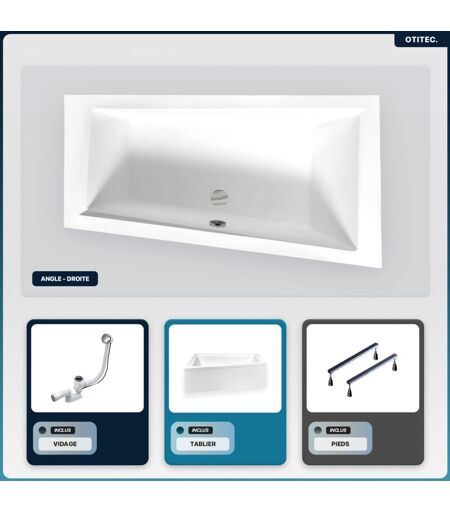 Otitec - Baignoire asymétrique - 160 x 90 cm - Droite - avec Tablier - Pieds - Vidage Chrome - intima