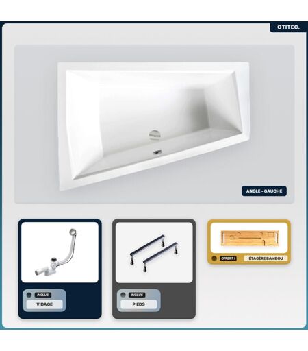 Otitec - Baignoire asymétrique - 170 x 125 cm - Gauche - sans Habillage - avec Pieds - Étagère bambou - Vidage Chrome - intima duo