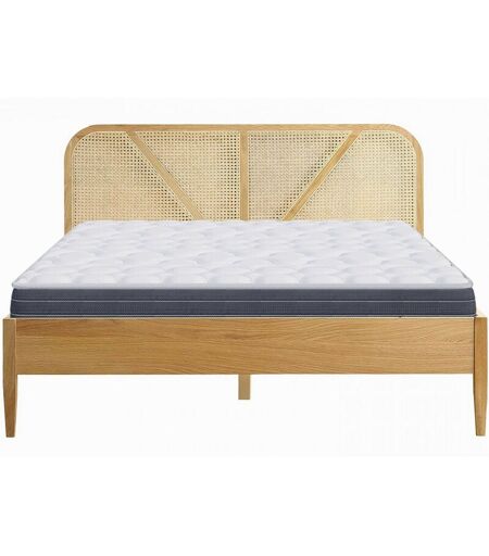 Ensemble lit + matelas Lit adulte en placage chêne avec tête de lit bois massif et cannage naturel - Leonie • Cadre du lit en MDF et placage chêne • Sommier 15 lattes en bois contreplaqué. Supports de lattes en pin massif • Cadre de la tête de lit en chêne massif avec cannage naturel • Couleur : chêne naturel • Pieds en chêne massif - hauteur 19 cm • Hauteur du cadre avec pieds : 36 cm • Dimensions de couchage : 140x190 cm • Dimensions de la tête de lit : 144,5x90 cm • Dimensions totales : 198x144,5x90 cm • Poids net du lit : 34,5 kg • Charge maximale autorisée : 220 kg Matelas tri-technologies • Mousse haute résilience 35kg/m3 • Mousse à effet mémoire de forme • Ame mousse haute densité • Epaisseur du matelas : +/- 22 cm • Fibre thermorégulatrice 90gr • Plate bande 3D fresh • Soutien ferme • 7 zones de confort • Indépendance de couchage • Aux normes Oekotex® • Garantie 5 ans • Le matelas reprend sa forme initiale entre 48 et 72h • Attention : une différence de +/- 3 cm de hauteur est ...