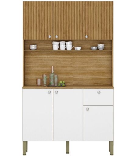 Buffet de Cuisine 6 Portes et 1 Tiroir Imitation Bois Exotique et Blanc Structuré STYLE Largeur 111 cm Largeur 111 cm Hauteur 185 cm Profondeur 39.3 cm Aménagement : - 1 Tiroir - 7 Niches (dont 5 fermées) - 6 Portes - 2 Tablettes - 5 Pieds (dont 1 de renfort) Caractéristiques techniques : - Bois certifiés FSC, issus de forêts gérées durablement. - Structure en panneaux de particules de bois épaisseur 12 et 15 mm - Arrière et fonds de tiroir en panneaux de fibres de bois (MDF) épaisseur 3 mm - Finition Coloris Imitation Bois Exotique et Blanc Structuré - 5 Pieds Plastique polypropylène - Poignées Plastique - Glissières de tiroirs métalliques - Charnières de portes métalliques - Garantie 2 ans - Poids total net : 40.3 kg. Dimensions utiles : - Niche 2 Portes Hautes Gauches Fermée : Largeur 71.3 cm Hauteur 43.3 cm Profondeur 26.1 cm - Niche Haute Droite Fermée : Largeur 35.1 cm Hauteur 43.3 cm Profondeur 26.1 cm - Niche Centrale Haute Ouverte : Largeur 107.6 cm Hauteur 16 cm Profondeur ...