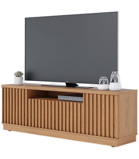 Meuble TV 70 Pouces Chêne 4 Portes 7 Niches 6 Roulettes AMAZONAS L 180 H 61.4 P 42.8 cm Longueur 180 cm Hauteur 61.4 cm Profondeur 42.8 cm Aménagement : - 7 Niches - 4 Portes en relief - 6 Roulettes dont 2 avec frein - Arrière percé pour le passage des câbles Caractéristiques techniques : - Bois certifiés FSC, issus de forêts gérées durablement. - Structure en panneaux de particules de bois épaisseur 15 et 25 mm - Arrière en panneaux de fibres de bois (MDF) épaisseur 3 mm - Finition Coloris Imitation Chêne - Garantie 2 ans - Peut supporter une TV de 40 Kg - Poids total net : 55 kg. Dimensions utiles : - Plateau TV : Longueur 180 cm Profondeur 42.8 cm - 1 Niche haute au milieu ouverte : Largeur 87.5 cm Hauteur 12 cm Profondeur 41 cm - 2 Niches basses au milieu fermées : Largeur 43 cm Hauteur 32.8 cm Profondeur 41 cm chacune - 2 Niches hautes latérales fermées : Largeur 43 cm Hauteur 22.4 cm Profondeur 41 cm chacune - 2 Niches basses latérales fermées : Largeur 43 cm Hauteur 22.4 cm ...